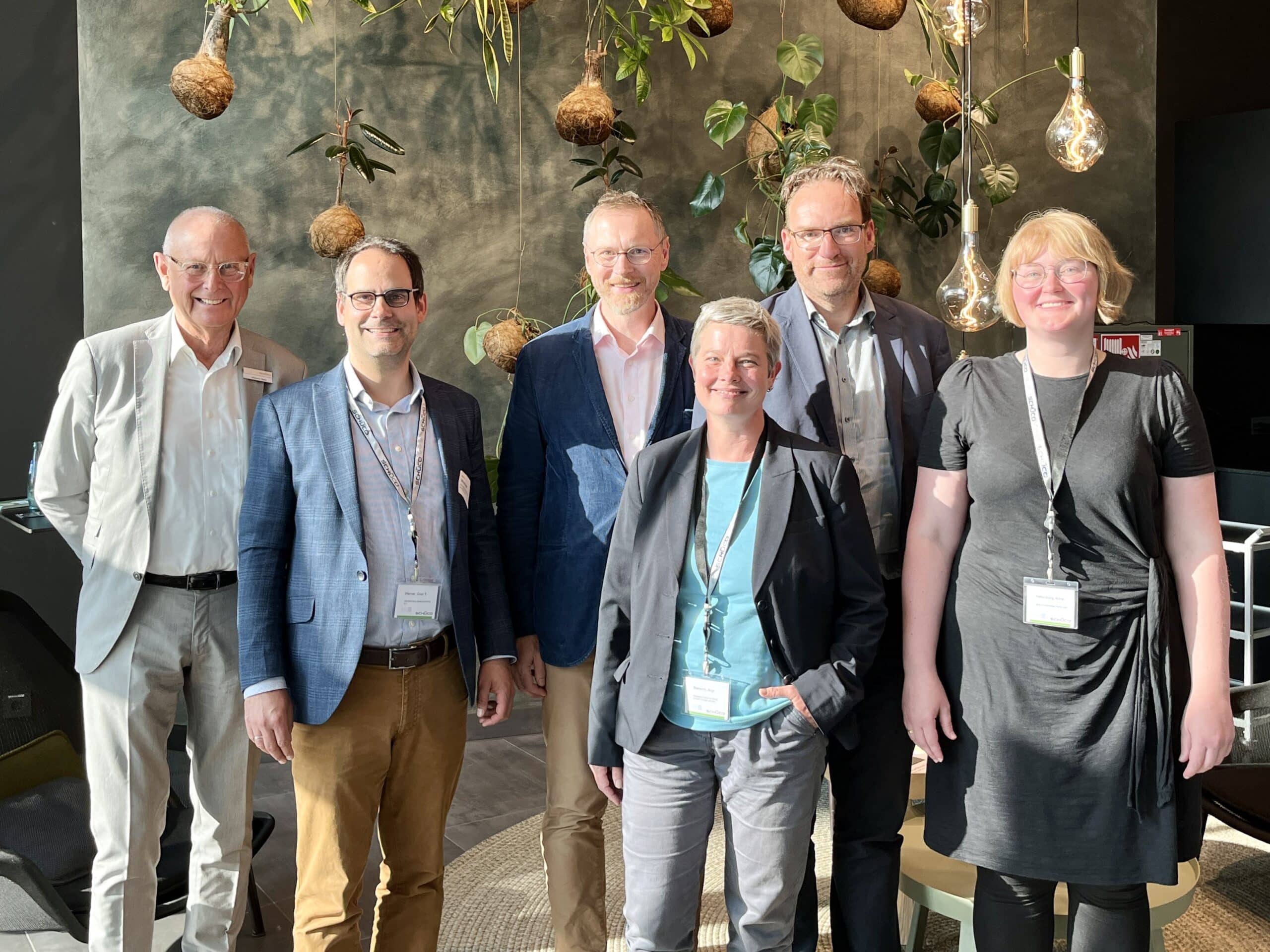 Die drei Referent:innen Anja Bierwirth (vorne), Anne Kettenburg (rechts) und Dr. Lars-Arvid Brischke (zweiter von rechts) freuten sich über das hohe Interesse an der Thematik und den regen Austausch mit den Teilnehmer:innen. Auch Moderator Dr. Bernhard Hauke (Mitte) sowie die beiden Gastgeber Goar T. Werner (zweiter von links) und Johannes Speis (links) waren sichtlich vom Erfolg der Veranstaltung begeistert. (Foto: Anna Müller, Schüco Showroom Frankfurt)